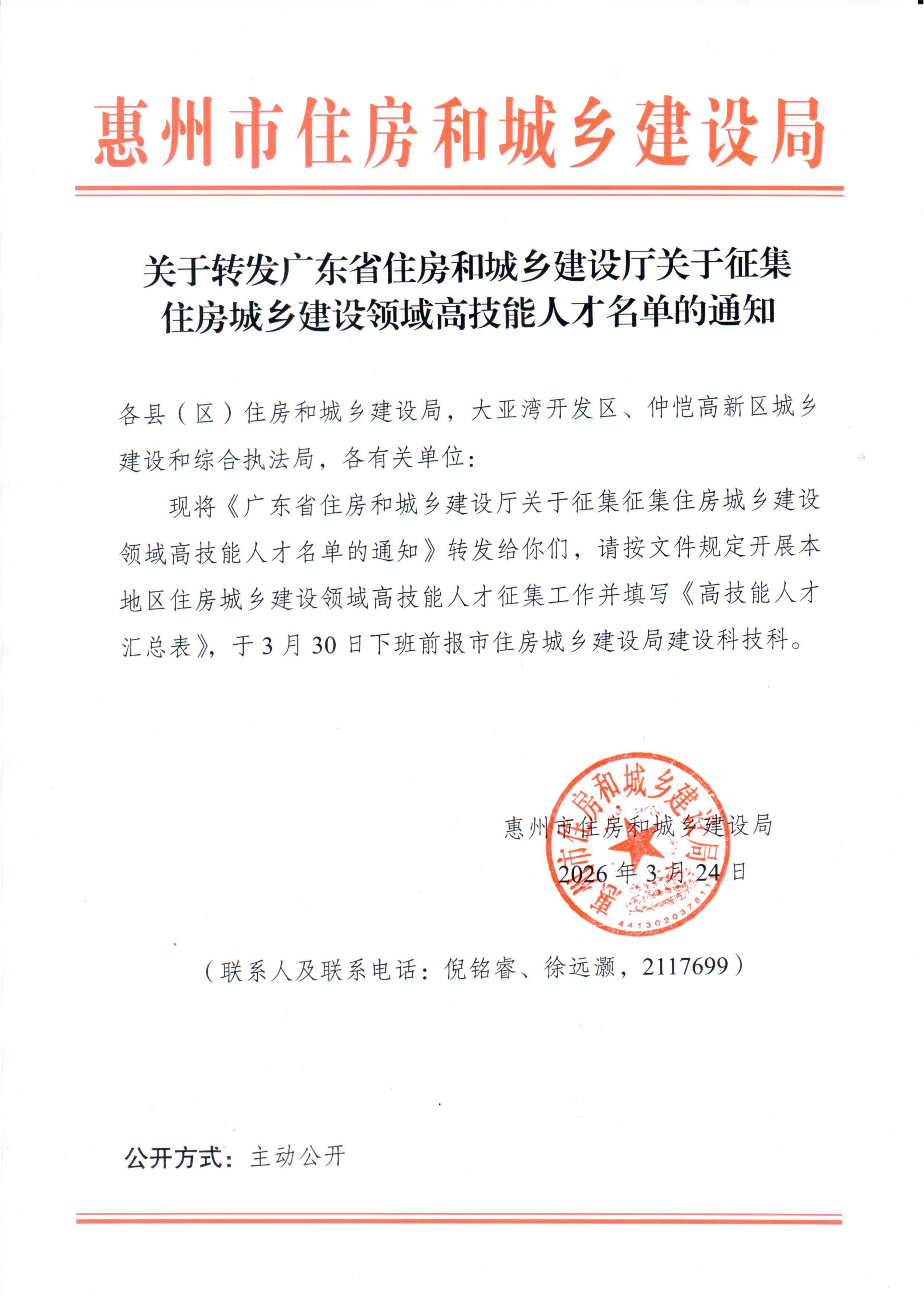 《关于转发广东省住房和城乡建设厅关于征集住房城乡建设领域高技能人才名单的通知》